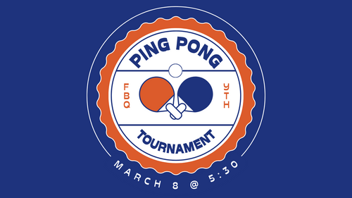 Sunday, March 8 @ 5:30, we will have a ping pong tournament in the youth room. Dinner and ping pong will be served. Sign Up in the youth room.